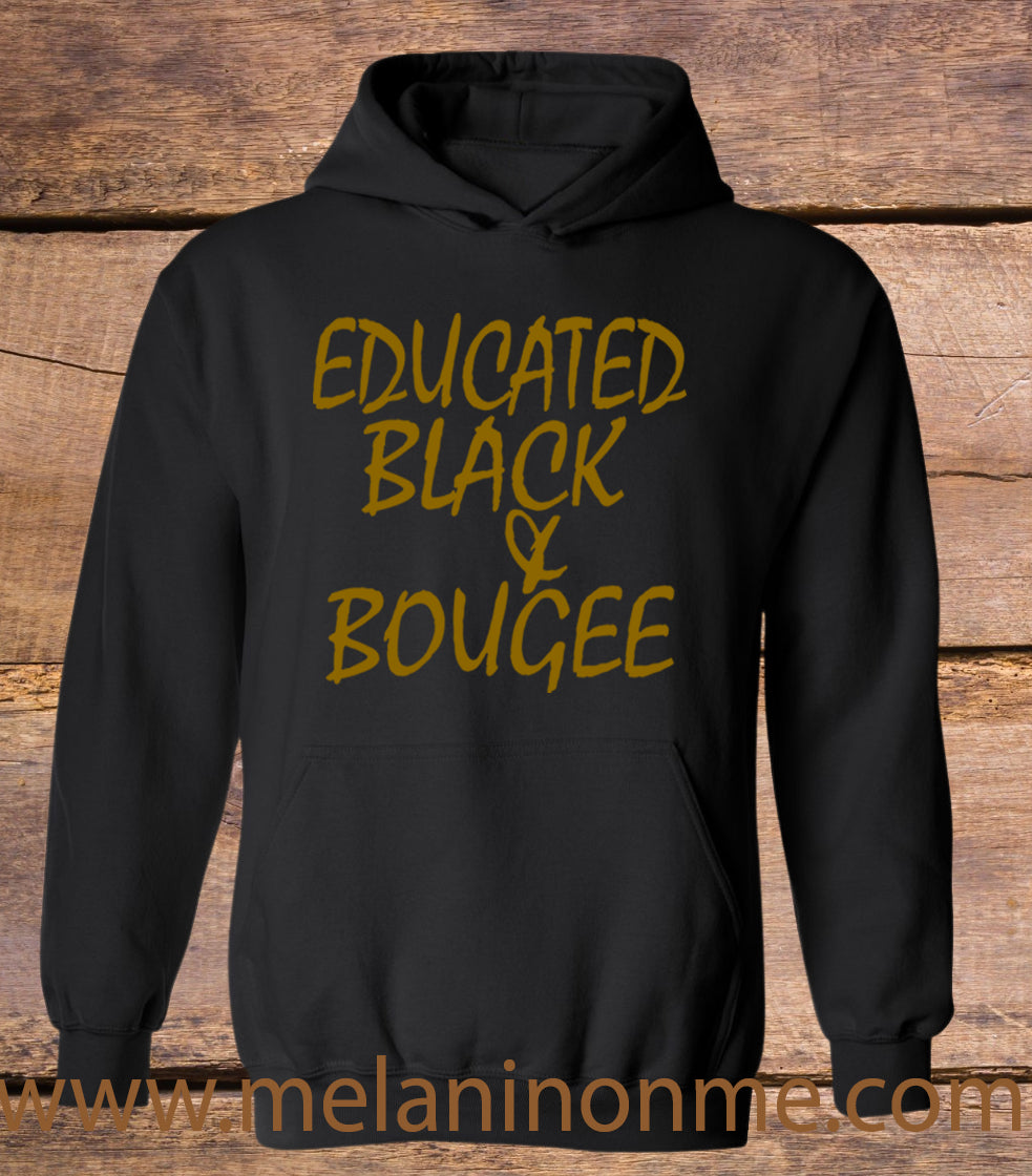 The "Educated Black and Bougee Hoodie" features a classic design with a relaxed fit that enhances your silhouette. The bold "Educated Black and Bougee" graphic on the front makes a powerful statement of pride and sophistication. The hoodie includes a drawstring hood and ribbed cuffs and hem, combining style with practicality.